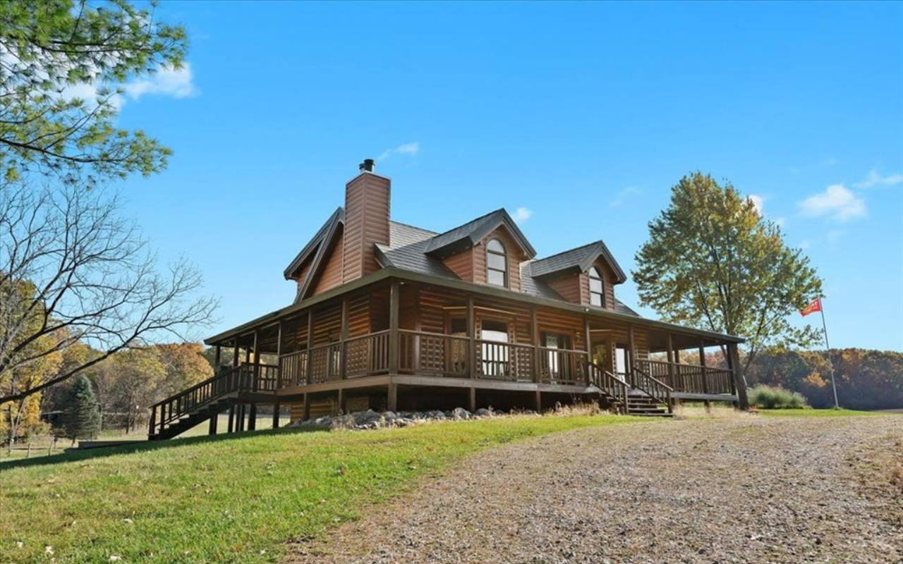 This stunning log home estate sits on over 72 scenic acres, offering unparalleled privacy and breathtaking views from a wraparound porch. Designed with geothermal heating for efficiency, this 1.5-story home features soaring ceilings, a stone fireplace, and an open floor plan. The property includes a 40’ x 80’ steel Quonset-style barn, additional livestock facilities, a 250’ x 150’ pond, and 29 acres of tillable land. With wooded areas and abundant wildlife, this estate is perfect for outdoor enthusiasts seeking a serene retreat close to major cities.