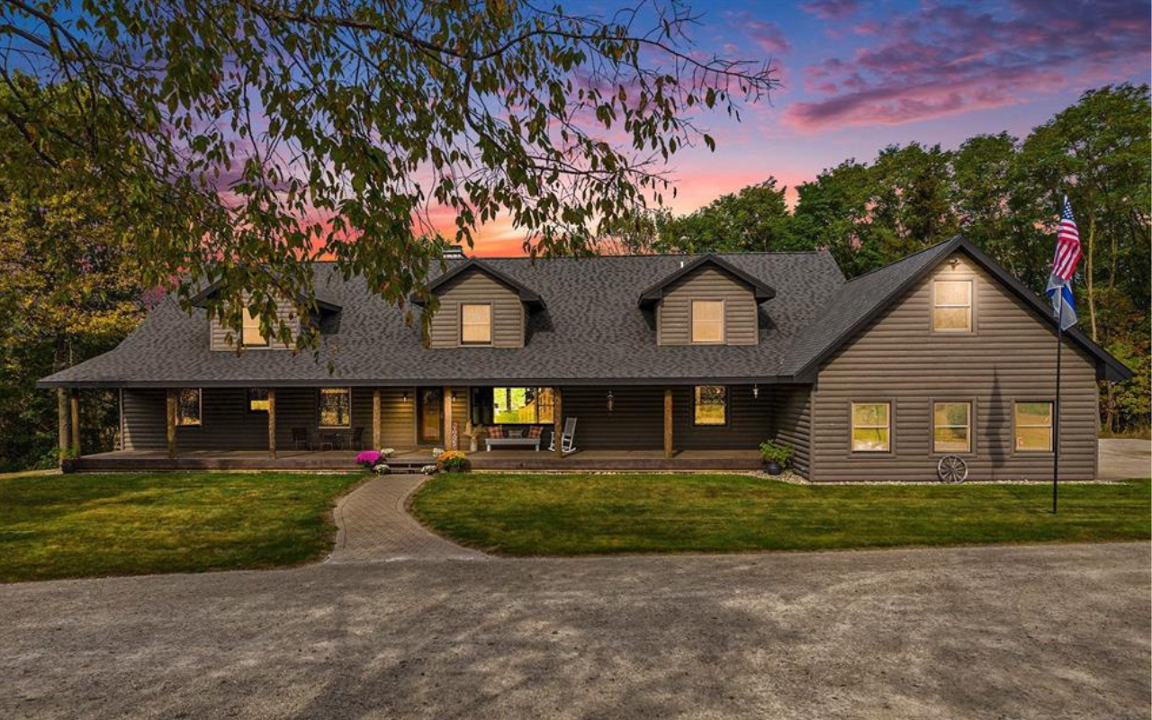 This stunning log-style Cape Cod home offers a perfect blend of rustic charm and modern luxury. Set on over 18 acres of wooded land, it provides a private retreat with breathtaking views of nature. The home features vaulted ceilings, a floor-to-ceiling stone fireplace, and knotty pine walls, creating a warm and inviting atmosphere. The recently renovated kitchen boasts quartz countertops, stainless steel appliances, and a spacious island. The first-floor primary suite includes a spa-inspired bathroom with heated floors, a freestanding tub, and a large walk-in shower. Additional highlights include an open loft, a finished walkout basement, a whole-house generator, and a large pole barn. Nature lovers will appreciate the extensive trails and serene surroundings of this exceptional estate.