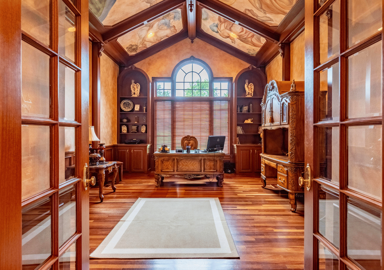 The living room provides plenty of space for family gatherings, complete with large window for natural lighting and a gas fireplace. Beautiful home office with custom mural.