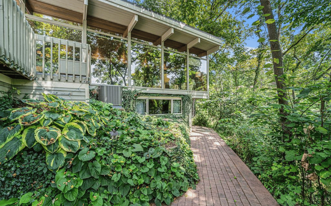 This George Brigham-designed contemporary home is a secluded sanctuary in Barton Hills, offering breathtaking views of Barton Pond and the Ann Arbor skyline. The property features a private pond with a waterfall, scenic paths, and a picnic area. The main floor includes a primary bedroom with a fireplace and access to the patio, while the second floor offers an additional primary suite with a private balcony. The lower-level family room, complete with a kitchenette, opens to a spacious patio, creating the perfect space for entertaining.