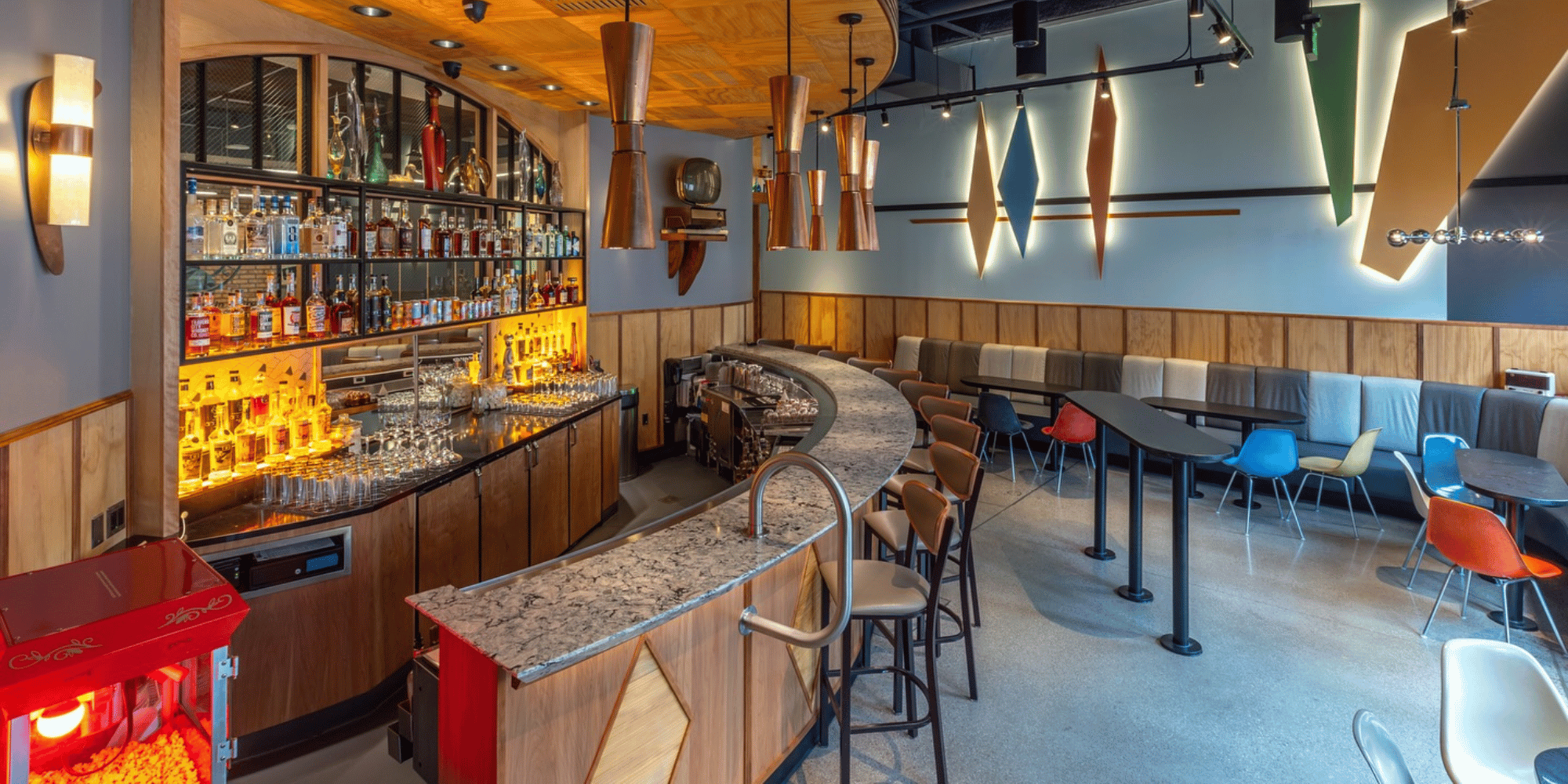 A dreamy hideaway tucked behind a velvet curtain in The Siren Hotel lobby, Candy Bar radiates retro allure with its Jayne Mansfield-pink walls, plush banquettes, and a glittering Parisian chandelier. Guests slip into an intimate, 30-seat lounge where elevated cocktails, like the whimsical espresso martini or inventive apple-cinnamon “Fallen Apple”, add flair to the romance of the experience. Happy hour (4–6 PM) tempts with discounted libations and snacks, luring a stylish crowd with its cinematic ambiance.