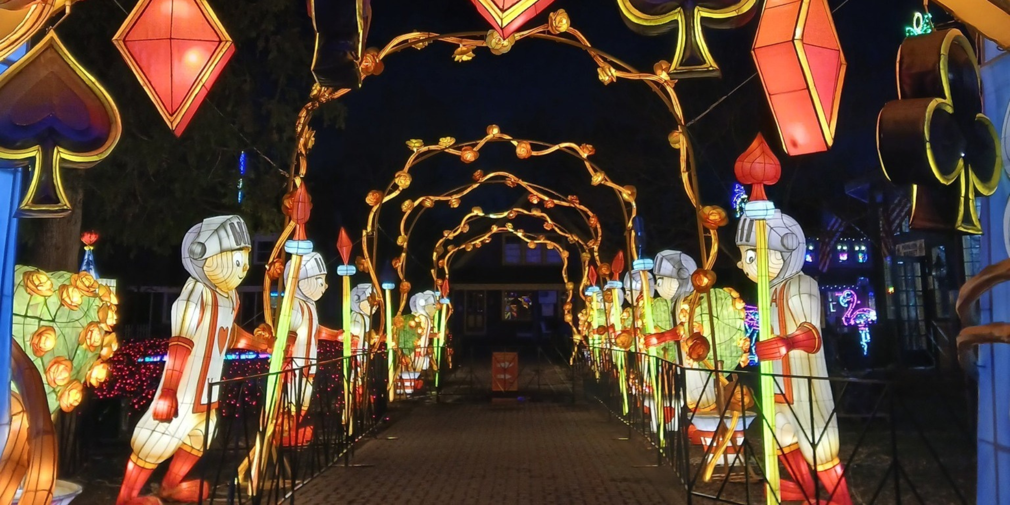 What’s remarkable is the craftsmanship – these lantern sculptures are hand-painted and constructed with care (in fact, sources mention they were brought over from Europe, specifically Poland, for this exhibit). The attention to detail is impressive: you’ll notice delicate patterns on the butterfly wings and elaborate costumes on the lantern characters. At night, the Alice in Wonderland lanterns glow from within, giving off a beautiful, soft light that’s perfect for gazing and photography. Families will have fun spotting their favorite story elements: “Look, there’s the White Rabbit!” or “I see the Mad Hatter’s tea table!” Kids’ faces tend to light up almost as brightly as the lanterns themselves when they recognize these beloved characters rendered in light. And for adults, there’s a sense of childlike wonder in seeing a familiar story presented in such an artistic, illuminated way. It’s a bit like visiting a themed light festival or the Detroit Zoo’s Wild Lights, but with a singular Wonderland twist that makes it unique to this event.