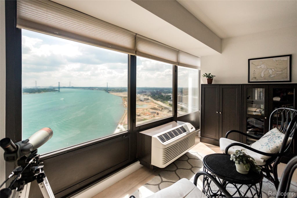 This luxury condo on the 22nd floor of the Riverfront Towers offers unparalleled views of the Detroit River. Located in a park-like setting, the one bedroom/one-bathroom unit features hardwood floors through-out, an updated kitchen with maple cabinets, stainless steel appliances, granite countertops, and a stackable in-unit washer and dryer. Resort-style amenities include a private marina, tennis courts, a state-of-the-art fitness center, a swimming pool, an on-site convenience store, direct People Mover access, and secured, gated parking. Just steps away from the brand new Ralph Wilson Riverfront Park, Corktown and Downtown