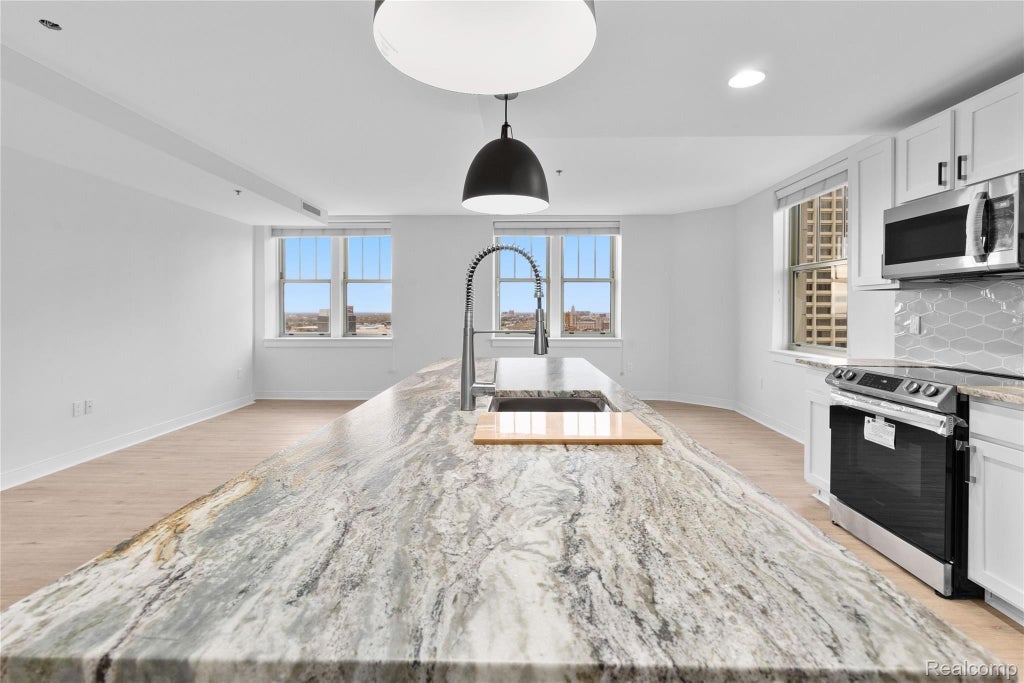 Located in the heart of Downtown Detroit in the historic Fort Shelby building. Experience daily sunsets in this spacious two bed, two bath sub-penthouse 20th floor corner unit overlooking the Downtown Detroit skyline with expansive views of the River from Corktown to the Renaissance Center. Carefully renovated in 2021 by a local interior designer, this special unit offers granite kitchen countertops with "leather" finish, all new fixtures and appliances. The master suite includes large walk-in closet and dual sink bath. Designer finishes throughout. Only steps away from Capitol Park, this loft is perfect if you want to work from home or are looking to enjoy all the excitement that city living has to offer! Secured parking spot and on-site personal storage included. Amenities: Hotel lobby bar and barista Shared hotel common space & access to the hotel gym and maid service Residential manager on site (based on schedule)