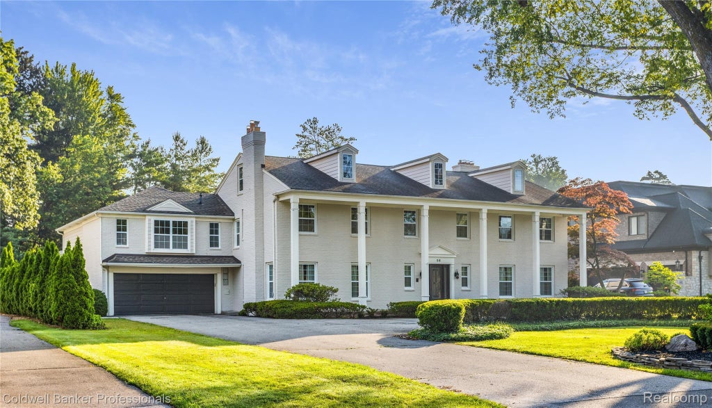 Located in the Village of Grosse Pointe Shores near the lake, this stunning Georgian Colonial sits on .56 acres of property and blends timeless architecture with modern luxury.This spacious and elegant home boasts an open circular floor plan, four car tandem garage and a spectacular 1,000 square foot pool house/guest house, salt water pool and hot tub. When purchased in 2011, the owners professionally renovated the house including roof, windows, electrical updates, plumbing, most mechanicals, added interior columns, a curved dining room wall, custom kitchen with island, high end appliances including double ovens and a wine refrigerator, bathrooms, primary walk-in closet, imported travertine tiles, wood floors, circular railing, wine storage room, basement flooring, large addition above the garage that consists of a laundry room, half bath, media room or bedroom plus a workout/recreation room and balcony. The main level flow seamlessly connects formal and casual living. The grand foyer features a beautiful circular railing, wainscoting, and welcomes you to a library, formal living room, family room, dining room, and kitchen. There are a total of five fireplaces and many windows overlooking the yard.