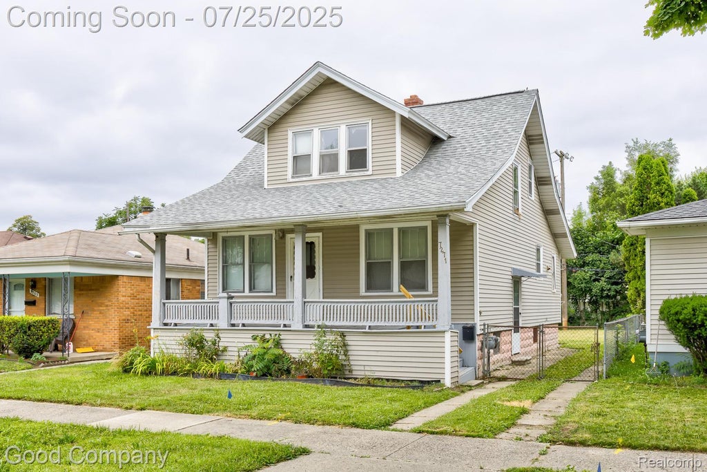 Charming bungalow in Center Line featuring a classic covered front porch and a spacious layout filled with vintage character and potential. Step into a bright living room with hardwood floors and a unique faux fireplace that adds a cozy focal point. The large dining room flows easily into a spacious open kitchen with plenty of cabinet space and direct access to the fenced backyard. One bedroom and a full bath are conveniently located on the main level, while two additional bedrooms upstairs share a second full bath. The basement offers laundry, tons of storage, and room to grow. Located just a short walk from local parks and the public library, this home offers a great blend of space, charm, and location. Welcome Home!