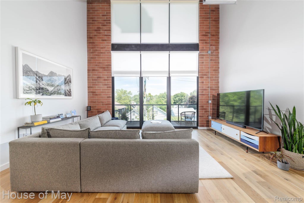 Experience luxury penthouse living, right in the heart of Ferndale. This stunning 2-bedroom 2-bath penthouse at The Lofts on 9 showcases approximately 1,500 SF of meticulously designed indoor space inspired by nautical elegance. Natural materials like Malibu wide plank oak hardwood floors with superior sound-insulated construction blend seamlessly with sleek, modern-industrial finishes to create an environment that’s both refined and relaxing. The open-concept kitchen is both beautiful and functional, featuring high-end stainless-steel appliances, minimalist European frameless cabinetry, and generous storage, perfect for everyday living and entertaining. A brick accent wall anchors the spacious living area, boasting 22-foot high ceilings, oversized windows with motorized remote-operated shades, and a private balcony with tranquil neighborhood views. A floating staircase with sleek cable railing leads to an additional 699 SF of lofted serenity. The expansive primary suite overlooks the living space below and includes a custom walk-in closet with cantilevered shelving and a spa-inspired bathroom with double floating vanities and a subway-tiled shower/tub combination. For added convenience, a discreet laundry area with a full-sized washer and dryer is tucked away behind French doors. Additional features of this penthouse include a secure lobby with a video entry system and a Tesla EV Charger added to the assigned enclosed parking with remote-controlled gate access, ensuring peace and privacy. This truly unique, design-forward penthouse has been newly remodeled with $74,000 in upgrades, showcasing true pride in ownership. Architectural designs are also included for adding a 655 SF rooftop terrace. Don't miss your opportunity to own this exceptional property in one of Metro Detroit’s most vibrant communities. Please contact me to schedule your private showing and experience elevated living in Ferndale!