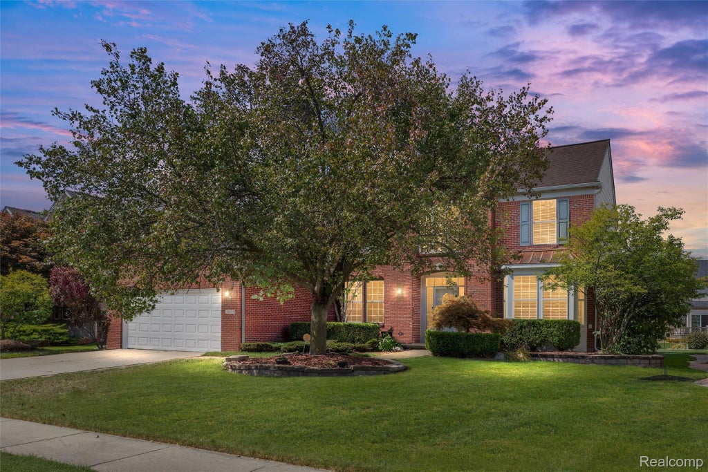 The heart of the home is a well-appointed kitchen offering rich dark wood cabinetry, granite countertops, a large center island, a pantry, a butler’s pantry, and hardwood flooring. A set of patio doors leads to a lovely brick-paved patio, providing a great space for outdoor dining and gatherings. Also on the main level is a convenient first-floor laundry room and access to a spacious two-car attached garage.