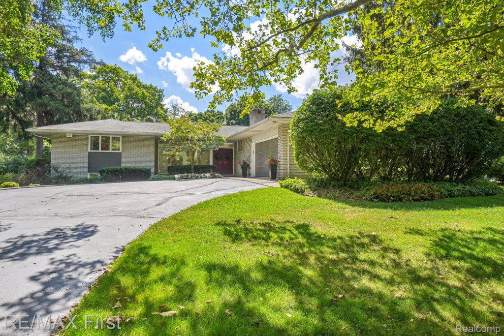 Welcoming mid century modern ranch. The panoramic front glass wall welcomes you into the open concept floor plan with adjoining living room and dining room with two large door walls for extra light. Updated kitchen with lots of cabinets and pantry storage with all appliances staying and offers plenty of space for a breakfast table. Cozy family room with stone fireplace. Updated half bath just steps from the oversized two garage. First floor offers a primary bedroom with ensuite bath with a ceramic tile shower and plenty of closet space. An additional bedroom and full hall bath complete the first level. The lower walk out level offers a great room with another fireplace and an adjoining game room and bar. Pool table stays with a ping pong cover! Two more spacious bedrooms and another full bath with dual sinks complete the lower level. Enjoy the expansive backyard from either the lower patio or the elevated deck.