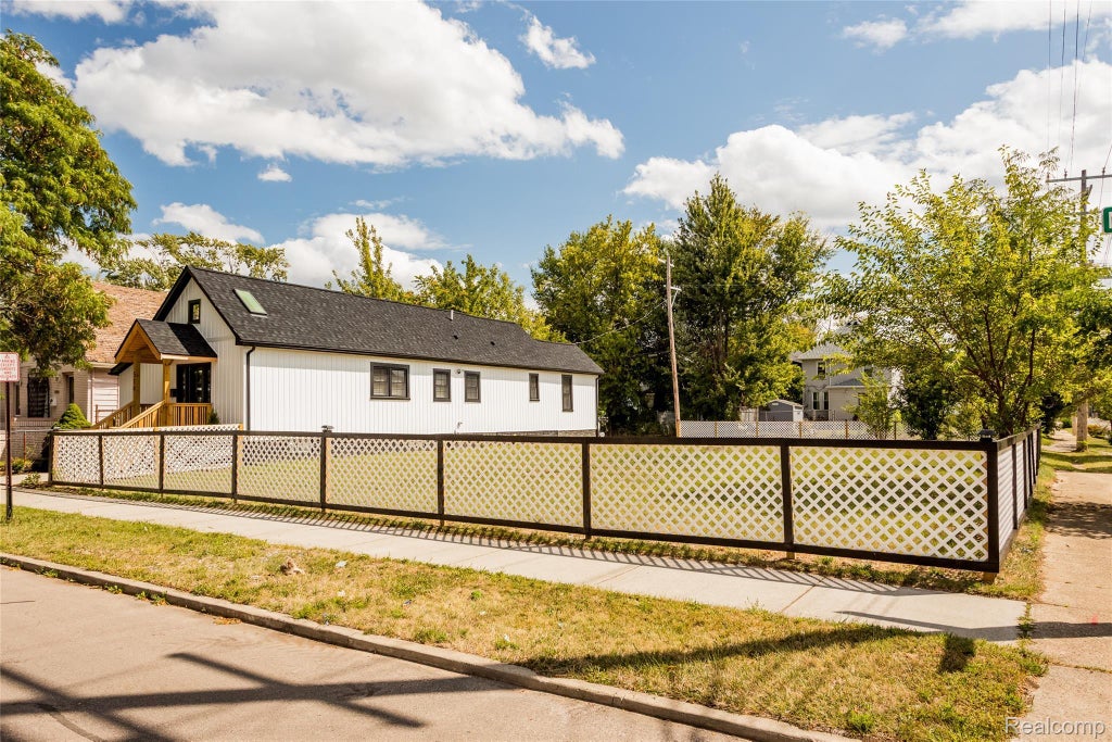 This renovated three-bedroom/two-bathroom shotgun-ranch in Detroit’s North End features a wide-open living area with vaulted ceilings, wooden beams and skylights, plus a striking black and white kitchen with a central island, quartz countertops, and stainless steel appliances. The primary bedroom includes a private ensuite bathroom and ample closet space. Backyard access comes directly from the alley, providing secure off-street parking. The sale includes the adjacent corner lot at 506 Mount Vernon, expanding the site to nearly 10,000 square feet with a massive fenced yard for entertaining, gardening, playing and outdoor options. Long term, the commercial zoning positions the lot for future projects and added value.