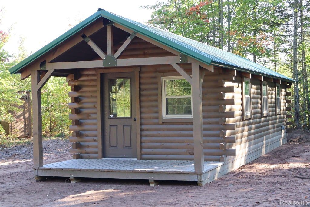 The parcel includes a brand new 14'x36' full D-Log cabin that is ready for immediate use. The cabin is wired and features a new outhouse, a generator plug, a ceiling fan/light, and a private bedroom. The ceiling is insulated with foam board under finished pine tongue and groove, and the layout includes a main living/kitchen area in addition to the bedroom.