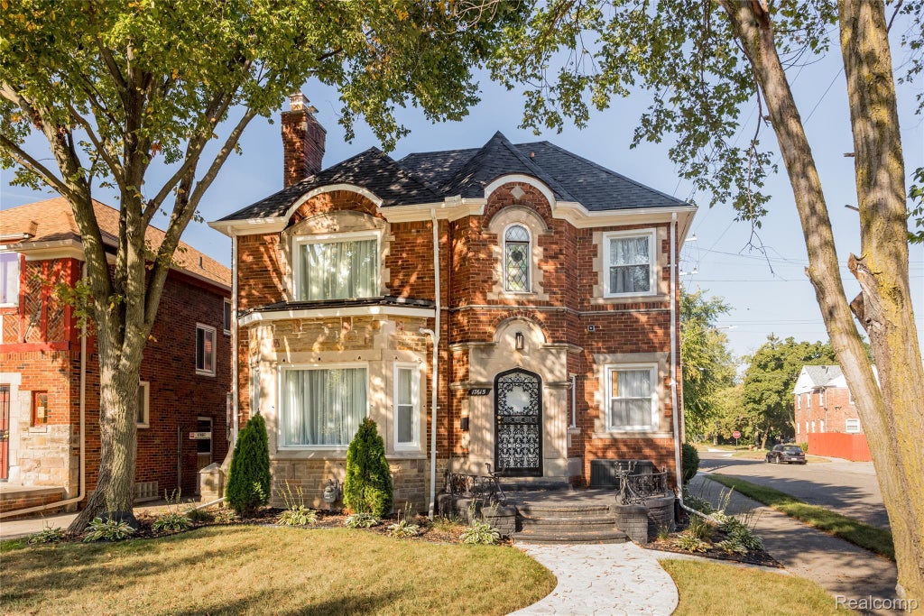 Built in 1932, this move-in ready, corner-lot Colonial offers a perfect blend of original character and modern updates. Completely renovated from top to bottom, the stunning brick showstopper features the best in historic details across all 2,600 square feet, including wrought-iron railings and gorgeously detailed crown molding throughout. The main level includes a huge living room with original fireplace; an office lined with built-in wood shelves; a formal dining room; powder room; sun-room leading to the private backyard; and a luxurious, modernized kitchen with quartz countertops, a six-foot eat-in island and black stainless steel Bosch appliances. The second floor features a large landing, a massive primary suite with en-suite bathroom, totaling four spacious bedrooms and two full baths, plus balcony and tons of storage. In the basement, there is a laundry room, loads of storage and a sizable finished space with original fireplace and top-notch vinyl flooring, perfect as a home gym or flex space. The backyard is a completely private and low-maintenance outdoor living space with privacy fence and paved patio leading to the two-car detached garage. Other improvements include; new concrete driveway, walkways and front porch, new custom metal roof over bay window, sprinkler system and more. Located in the desirable Bagley neighborhood, minutes from the University of Detroit Mercy, Livernois Avenue of Fashion, Bucharest, Kuzzo's Chicken & Waffles, Palmer Park, Detroit Golf Club and more.