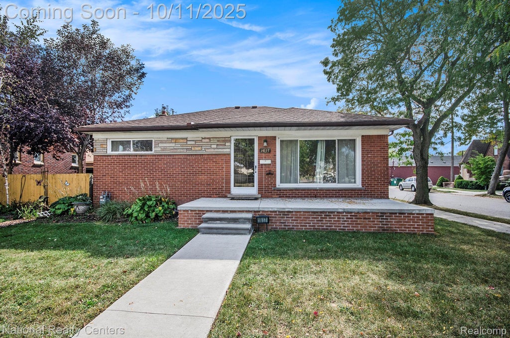 Welcome to this beautiful 2-bedroom 1 bath Brick Ranch located on a corner lot in a quiet low-traffic neighborhood. This home offers nearly 1,000 sq ft of comfortable living space with hardwood floors throughout. Living room has large picture window that lets in plenty of natural light. The open kitchen has tons of cabinet and counter space and flows directly into dining room area-perfect for family dinners or just enjoying a quiet meal. House has full partially finished basement adding even more living space. Two car detached garage has its own 100-amp electrical service and features a Kentucky-style overhang- ideal for family gatherings or just relaxing after a long day. This house has plenty of parking and storage for extra vehicles or recreational toys. Besides parking in front of house there is also a driveway on side of and oversized driveway in backyard with alley access. 1ST FLOOR LAUNDRY!! LOW MAINTAINENCE BACK YARD!! Located just minutes from downtown Wyandotte, restaurants, shopping, and parks. Updates include new driveway (2024) New central air (2024) New Roof (2020) Updated furnace (2024) New vinyl siding on Garage (2024)