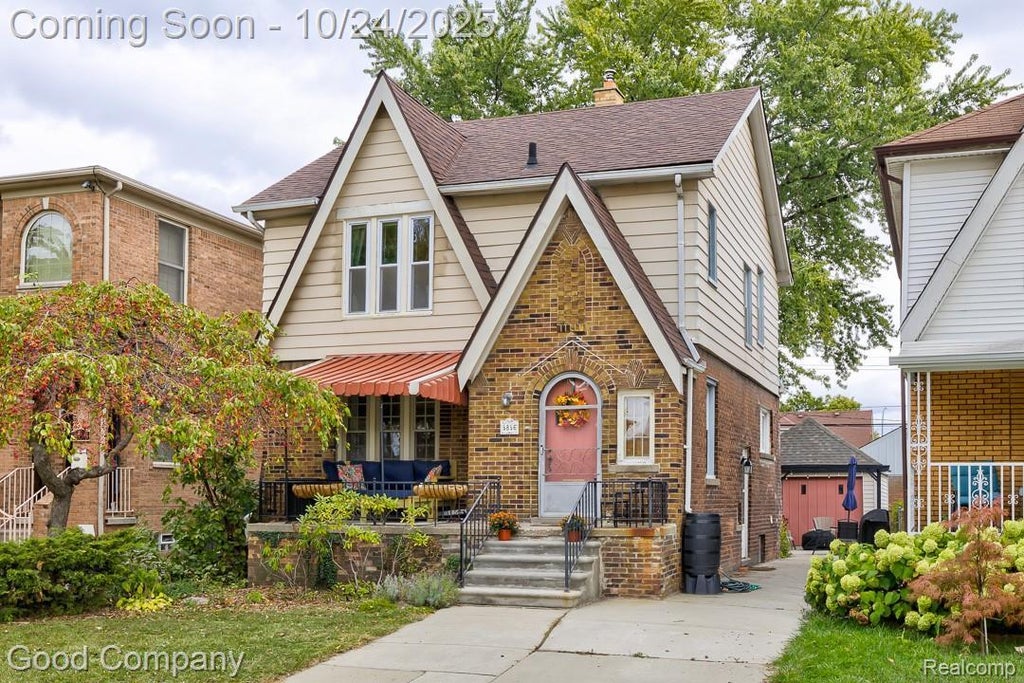 Matterport virtual walkthrough available on Homes. Move-in ready Tudor charmer in the heart of Dearborn offering classic character, smart updates, and a beautifully landscaped backyard retreat. A welcoming covered front porch leads into a warm living room with coved ceilings, rich wood trim, hardwood floors, and a cozy fireplace flanked by built-in shelves. An arched doorway opens to the elegant dining room with dramatic wall trim and into a bright sunroom that connects to a convenient half bath. The kitchen has been tastefully updated with stainless steel appliances, fresh wood cabinetry, white countertops, and a sleek subway tile backsplash. Upstairs, three comfortable bedrooms share a stylish full bath, with the spacious primary featuring a delightful window bench. The partially finished basement adds great additional space with a kitchenette, laundry area, and extra storage. Step outside to a fenced backyard oasis complete with string lights, pergola seating, lush gardens, and a detached garage. Welcome Home!