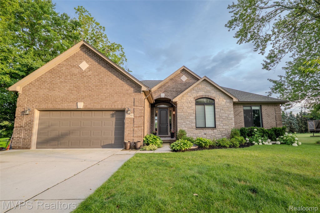 This stunning 2019-built ranch home offers everything you've been looking for—and more! Located on a spacious .67-acre lot with no HOA, this 3-bedroom + office, 2.5 bath home combines thoughtful design, high-end finishes, and unbeatable convenience. The heart of the home is the dream kitchen featuring granite countertops, an oversized island, Lafata soft-close cabinetry, stainless steel appliances, and soaring ceilings with crown molding—perfect for cooking, entertaining, or gathering with loved ones. Enjoy cozy evenings by the gas fireplace in the great room, framed by panoramic windows that overlook the expansive backyard. Need a home office or playroom? French doors lead to a bright, private workspace ideal for remote work or study, or a dedicated space for the little ones to play. Retreat to your luxurious double-door master suite, complete with a spa-like bathroom featuring granite counters, a large soaking tub, a separate stand-up shower, and a spacious walk-in closet with built-in organizers. Two additional bedrooms feature plush carpet and generous closets. The partially finished basement offers tons of potential, with a full bathroom already framed—add your finishing touches! Step outside to a beautifully landscaped yard with a large aggregate patio, perfect for entertaining, relaxing, or enjoying outdoor games like soccer, football, golf, putting, or volleyball. Additional highlights include: Attached 2-car garage, ample storage and closets throughout, highly acclaimed Romeo Schools, including India Hills Elementary. Prime location near apple orchards, parks, trails, golf courses, dining, and shopping. Walk or bike to Orchard Trail & Verellen's Orchard Market. Minutes from M-53, Stoney Creek Metropark, and Downtown Rochester. Just in time for the holidays—this home is a 10+ and ready for you to move in and make memories! BATVAI. Room dimensions approximate.