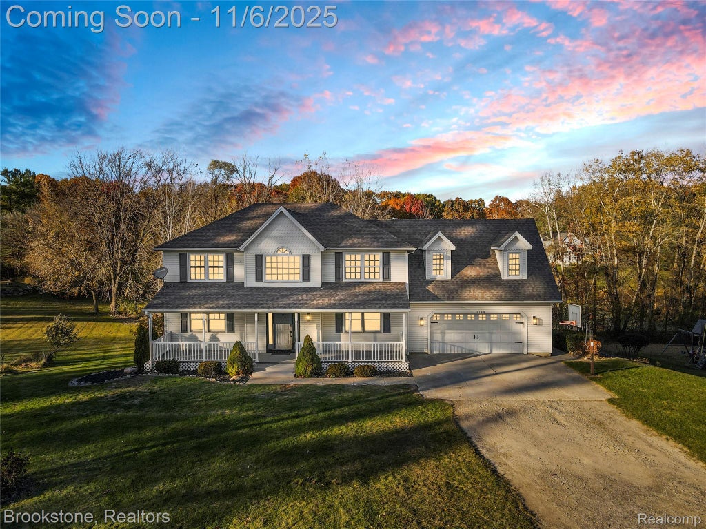 Welcome home to your beautiful country Cape Cod on 5 acres located in Almont & Dryden area minutes from major highways (M-53 & I-69)! This spectacular home features over 2800 square feet of finished living space, 3 bedrooms & 2.5 baths with a partially finished walkout basement! Beautiful curb appeal and a picturesque covered porch and as you step inside to the welcoming foyer you will find hardwood floors running through the hallway, kitchen, library and breakfast nook. A spacious living room features fresh paint & brand new carpet, the kitchen has SS appliances (newer fridge & dishwasher) with island and bar seating area, and an office/den with wainscoting and glass French doors. Upstairs boasts a generous primary suite, spacious walk in closet, sitting area perfect for a nursery/office and large primary bath with double sinks. Two other bedrooms, a massive bonus room perfect for a 4th bedroom or media area features hardwood flooring with a 2nd full bath finish up the 2nd level. The property is 5 acres with beautiful mature trees & pond perfect for those who like to hunt and above ground swimming pool. Many updates/upgrades throughout: new carpet (‘25), freshly painted throughout, powder room (‘23), some new windows (‘25) (living room on west side of house and all upstairs windows on front/south side of home), washer/dryer (‘19), house wired for whole home generator and much more!
