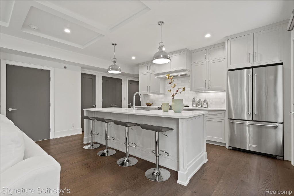Welcome to Park West luxury residences, offering refined condo living just blocks from Downtown Royal Oak. This 2-bedroom, 2-bathroom condo features rare private elevator access, a private balcony, an attached garage, and dedicated parking—a true rarity for condo living in Royal Oak. Spanning 1,400 sq ft, this home is filled with natural light from wraparound windows and thoughtfully designed with premium finishes and detailed trim work. Highlights include 9’ coffered and tray ceilings, 8’ solid core doors, recessed lighting, wide-plank European oak hardwood flooring, and cozy carpeting in the bedrooms. The light-filled great room flows into a chef’s kitchen equipped with custom cabinetry, stainless steel appliances, Caesarstone countertops, and an oversized island—perfect for entertaining. A 150 sq ft flex room adds extra versatility as an office, gym, or storage space. Enjoy the comfort of a spacious primary suite, beautifully appointed bathrooms, in-unit washer and dryer, central air, and more. This is the perfect opportunity to combine modern living with a vibrant downtown lifestyle!