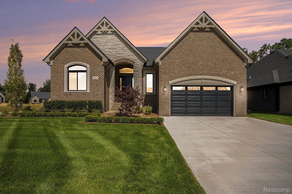 Refined elegance meets low-maintenance living in this custom 2,374 sq ft new-construction ranch on a premium lot in Washington Township’s Villas of Veridian—one of Macomb County’s most desirable luxury ranch communities. Designed with 10–12 ft ceilings throughout, including a 12 ft foyer and a 12 ft stepped ceiling in the great room, the home delivers volume, light, and craftsmanship across a modern, intentional layout. The great room features a floor-to-ceiling porcelain fireplace with white-oak mantel, illuminated floating shelves, and black-trim Andersen windows beneath the elevated ceiling. Sculptural pendants lead into a chef’s kitchen appointed with Lafata soft-close cabinetry, an espresso island, full quartz slab backsplash, under-cabinet lighting, and a vented stainless-steel hood over a centered undermount sink framed by an architectural window.