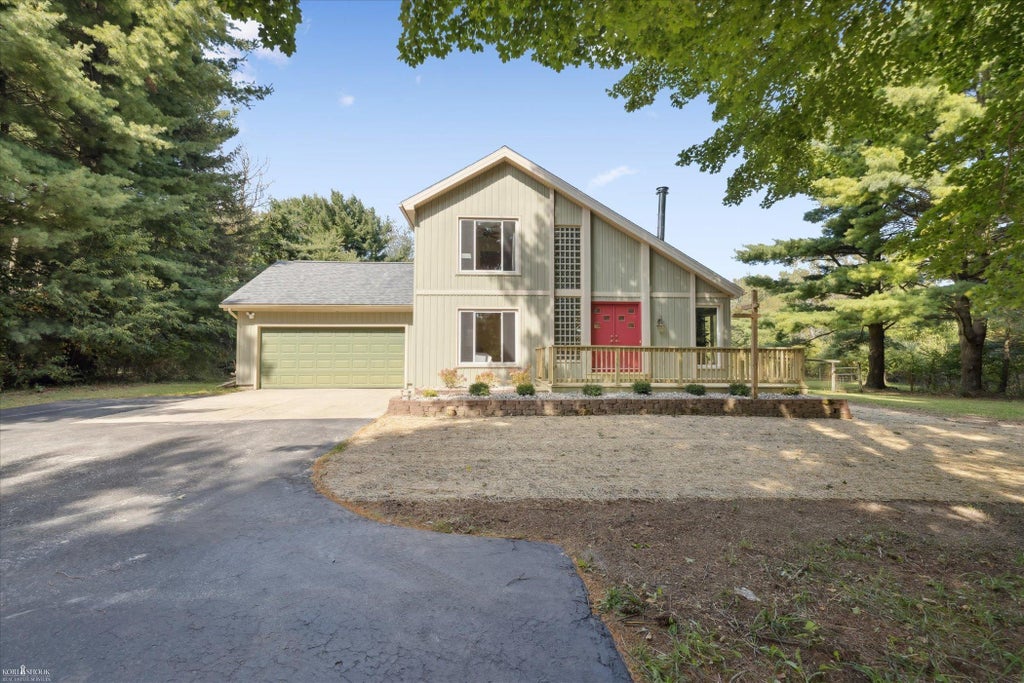 OPEN HOUSE Sunday, Sept 14 from 230pm to 4pm! Beautiful contemporary home sitting back on 10 acres! Gorgeous new custom kitchen with modern solid surface tops and fixtures! Open living space featuring vaulted ceiling, free-standing wood stove and glass block accents. Hardwood floors throughout. Main floor bedroom and new bath with walk-in shower. The upper level offers a primary suite, with another new bath, plus an open flex space, perfect for office or possible 3rd bedroom. Partially finished basement. New roof, sliding door, decks on both the front and back of home and more! Many other updates in the last few years including siding, windows, furnace and skylights. 2-car attached garage, pole barn, garden areas, and even extra sheds for the chickens or goats!