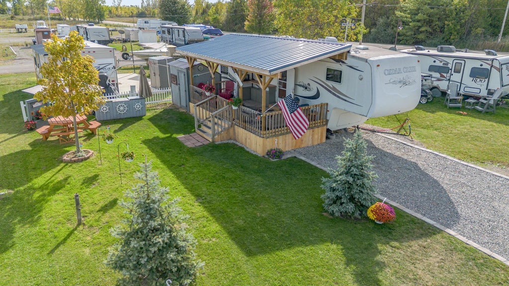Vacation/ Snow Birds/ Fishing Stunning RV w many updates waterproof flooring, plumbing, electrical, awnings over slide outs and more. Large deck covered with a metal roof, complete with outdoor furniture and bar area. Shed contains new washer and dryer with refrigerator and more. Maple tree over octagon picnic table and pines are welcoming with privacy. 30 amp and 50 amp service. Water available all year. City water and sewer, full hook ups. Own a turn key unit in a campground condominium RV park w/ boat slip on canal to Lake Huron / Saginaw Bay. Golf cart community. The Clubhouse contains bathrooms, showers, laundry, pool and, of course, a full kitchen and party area. Fish/ Boat/ or Kayak all day then ride your golf cart to the restaurants or Music In Park at Au Gres Park. Gated community with pool, clubhouse, outdoor pavilion and facilities. Holiday cornhole tournaments, Trick or Treating,and more. All ages welcome. Yearly association fee: $480.00 Taxes are based on Vacant Land