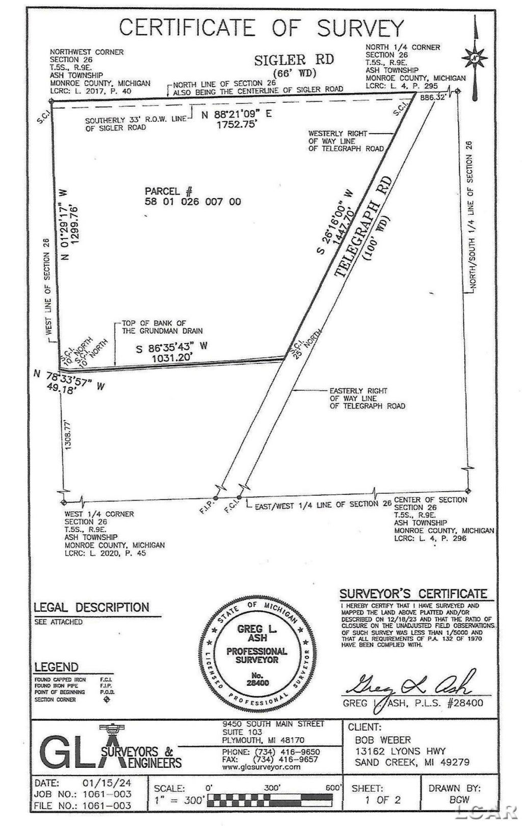 Great location in area of heavy trucking,transportation hub. Master planned Multi Use ag/commercial. Telegraph Rd. 275/75 main corridor w/ easy access to all major routes.1 mile north of 275 Exit 2. Rare 1400 +- ft. Telegraph frontage. Level site,excellent boundaries. Corners on Sigler Rd w/1700 ft frontage. 2 miles to New Ford industrial park. New survey. Acreage can be divided, large parcel controls excluding 2.2 acres for house and outbuildings per survey. Currently income producing. Agent is seller.