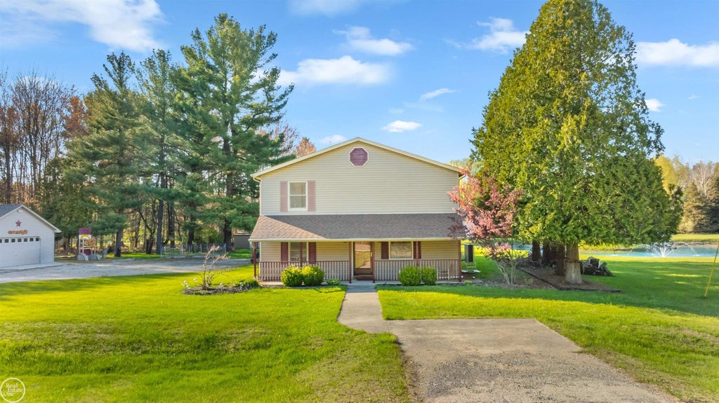 Welcome to your own secluded paradise in Forester Township! Nestled on 3 serene acres and surrounded by mature trees, this unique and tranquil property offers the perfect setting for a year-round residence or a home away from home - just minutes from Lake Huron and Delaware Park. Every detail has been thoughtfully designed for comfort, beauty, and function. Experience the calm and beauty of a landscape filled with wildlife and lush, natural views. The highlight of the property is a large, private pond with a remote controlled fountain and colorful lighting you can operate from inside the home. A newly added (2023) outdoor patio provides the perfect space for entertaining or simply relaxing while enjoying the tranquil views. There's also a cozy screened-in sitting area - an ideal spot to unwind and take in the sights and sounds of nature, especially during a peaceful rainfall. The pond surrounds a non-operational helipad. Storage and utility abound with a 2-car detached garage with a carport, two sheds (including one that is 288 sq ft), and a massive 30x60 pole barn with electricity, ready for storing boats, jet skis, snowmobiles, ATVs and more. Inside, the 2,704 sq ft home is just as impressive. This 2-story layout includes 3 spacious bedrooms - two guest bedrooms on the first floor and a private primary suite upstairs with double-door entry, full bath, and walk-in closet. In fact, all bedrooms have walk-in closets - a rare and welcome feature. Upstairs, a stunning 33x20 family room with hardwood floors and custom woodwork leads into a year-round sunroom offering breathtaking views of the pond and property. Downstairs, in addition to the two guest bedrooms, enjoy a large eat-in kitchen, first-floor laundry, full bathroom, pantry/storage area and an expansive living room - added in 2023 - featuring walls of windows overlooking the pond and woods, hardwood floors, custom woodwork, and a door wall that opens to the patio. It's a perfect blend of rustic charm and comfort. Recent updates include a new roof and shutter