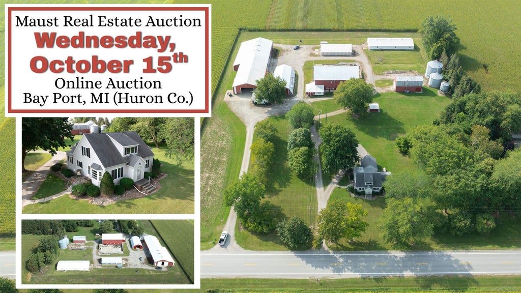 Property to be sold by Online Auction closing the night of October 15th - call for more information! Tract 1 "“ 4.6 Acres with 6 Buildings and Grain Storage This property is the former site of Maust Enterprises/Farms, Inc. and includes six buildings, grain storage bins, and a well-equipped main shop facility. The main shop building measures 54' x 120' with an attached 15' x 20' lean-to and a 70' x 80' storage shed addition. At the front of the shop is a finished 32' x 30' office and lobby area. The building is serviced by 400 Amp, 3-phase electrical power and includes a 10 hp air compressor with pneumatic air lines plumbed throughout, cement floors, a 2.5-ton overhead crane and a 1-ton jib crane. There is a concrete apron around the exterior. Access to the building is provided by multiple doors: one 24' x 14' overhead door, two 18' x 13' and 14' overhead doors, and two 27' x 16' sliding doors, as well as standard entrance doors and windows. There is a half bath with it's own septic and a shared well with Tract #2. Buyer will need to install their own well unless they also purchase Tract #2 or reach an agreement with the new Buyer. Additional structures on the property include a 40' x 75' quonset shed, a 40' x 100' hog barn, a storage barn measuring 32' x 66', a 40' x 80' livestock barn, and a 22' x 50' storage barn. Grain storage facilities include two Stormor bins (16,000 bushels and 7,500 bushels) with full-floor aeration, fans, sweep augers, and 8" unload augers. There is also a Brock 2,000-bushel hopper bottom bin. The Buyer will have immediate possession upon closing. In addition to the 4.6 acres, an adjacent 3- acre parcel to the east is available for purchase after the auction. Tract 1 may be bid on individually or in combination with Tract 2. Tract 2 "“ 4 Bedroom Home on 2 Acres Featuring a well-maintained, mid-century 4-bedroom, 1.5-bath home on a 2-acre parcel (330' frontage by 264' deep). The home includes an additional pass-through room to the first-floor master bedroom, suitable for a nursery, offic