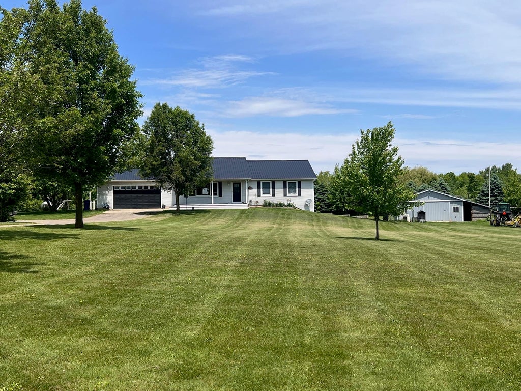 Great 3 bedroom ranch built in 1999! Home features 3 bedrooms and 2.5 baths on the main level, plus a full partially finished walkout basement with family room and (2) office/den spaces! Oak trim and solid doors through-out the main level! Home sits on 2.62 acres and has a pole barn with enclosed lean-to, storage shed, above ground pool, deck and patio area, plus a covered front porch. New steel roof was installed in 2021 on the house and garage. Open floor plan and cathedral ceilings in the main living space.