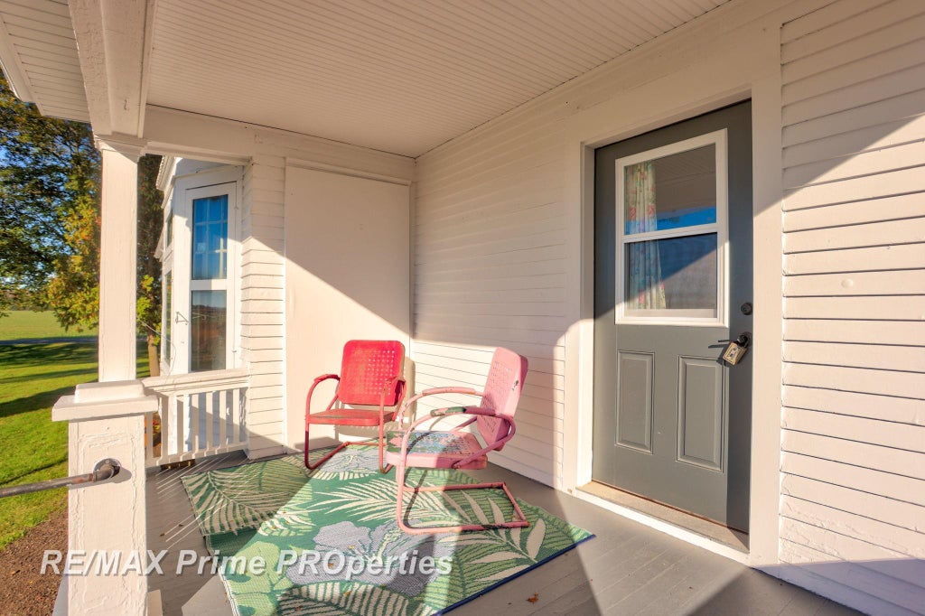 Welcome Home to Country Charm & Comfort in your new Farmhouse! Exterior has just been freshly painted & landscaped.  Step inside from the Grand front porch or the inviting covered side entry and discover a home bursting with character and warmth.  You will find 5 spacious bedrooms (and a possible 6th) 2 full baths-including one conveniently located off the main-floor primary suite-there's room for everyone to spread out and feel at home.  Gorgeous original woodwork, a stunning staircase, & 2nd staircase from kitchen, vintage stained glass windows (some windows updated!) give this home timeless charm, while the updated kitchen and newer carpeting in the living room add cozy and convenience. The basement is clean, dry, light & bright, & functional, featuring two upscale Mustang sump pumps and a ready-to-enjoy craft room. All appliances stay-including the freezer, & Speed Queen washer & dryer.  You'll appreciate the recent updates: newer roof, newer septic tank and field, insulation, and a new Culligan water softener.  Outside, it's pure serenity: a beautifully landscaped yard with a sandy "beach" area beside a soothing double waterfall, perfect for morning coffee or evening relaxation. Enjoy the detached 2-car garage with workshop, plus an extra cement pad behind & beside for projects or parking. Extra for the hobby farmer, the "She Shed," chicken coop, lilacs, plum trees, and a blooming pollinator garden-everything you need for peaceful country living.  Come home to the country... where character, comfort, and nature meet.  Call office for complete listing detail.