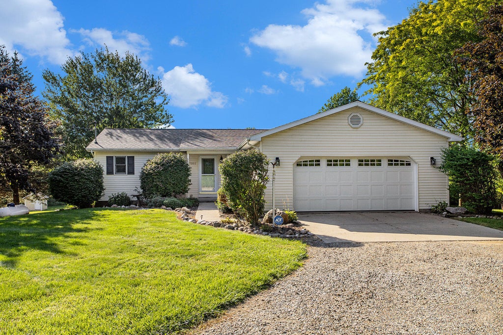Where to begin with this well maintained ranch with finished lower level walkout on over 10 acres. The home is lovely and spacious with luxury LVT wood flooring throughout. The kitchen features quartz countertops, a farmhouse sink and newer appliances. There is a large deck off the kitchen. The primary ensuite has a walk-in closet and it's own balcony. Downstairs you'll find a second family room and 2 more bedrooms and another room for your office or play room. All with new carpet. But for those looking for a pole barn, this is it! The barn is wired 220, has concrete floors and is heated and cooled with a minisplit. This location is just beautiful and you should enjoy lovely evenings around the firepit enclosed by a swingset pergola with wooden swings, projector tv, and lights. Security system for house and barn, new water softner, attached 2+ car garage and so much more! Call Angela for your private showing before this one gets away!