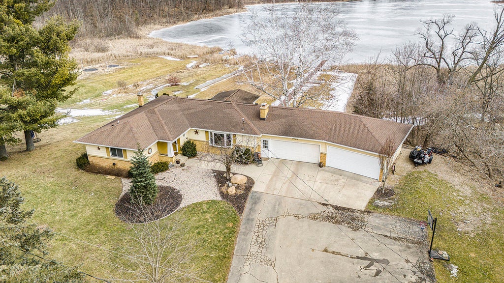 Experience the perfect blend of luxury and waterfront living in this stunning custom-built home. With just over 3,200 finished sq. ft., this ranch-style retreat sits on 2 acres with 200 feet of private frontage on Ware Lake, offering breathtaking views and year-round recreation. The open kitchen features quartz countertops, stainless steel appliances, and ample cabinetry, flowing into a fireplace-lit living room, dining area, and four-season room. The primary suite includes a gorgeous private bathroom with a huge walk-in tile shower and dual vanities with granite tops. The lower level walkout boasts a family room, second kitchen, full bath, three additional non-conforming bedrooms, and patio access. A four-stall garage, viewing deck, and boardwalk complete this exceptional home.