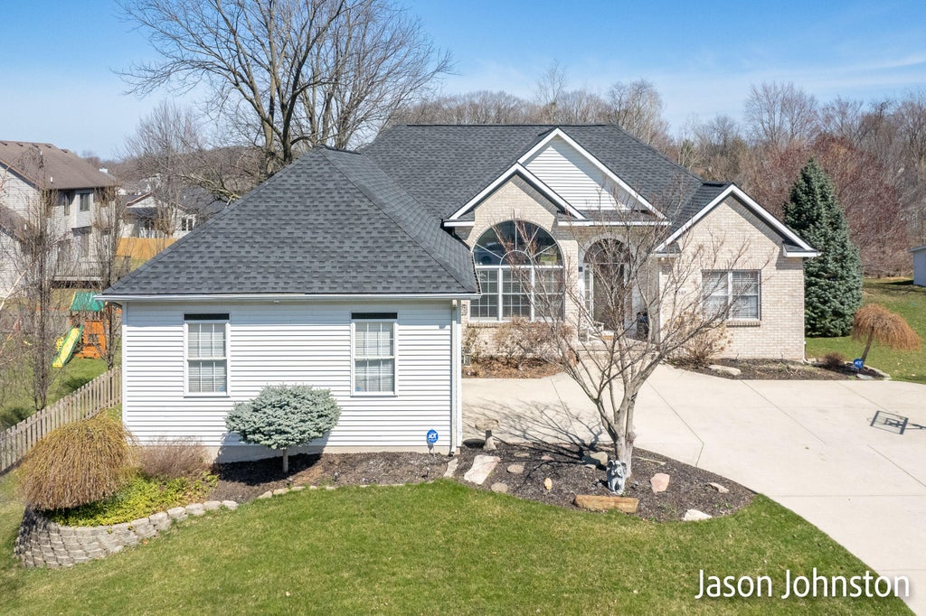 This custom-built walkout ranch is located in a quiet neighborhood with great schools. Beautifully updated 5-bedroom home has renovated kitchen with granite countertops and open floor plan. Main floor primary suite with his and hers walk-in closets. The cathedral ceilings in living room allow abundance of natural light. Finished lower level featuring 2 large bedrooms, living room with gas fireplace, full bathroom and second full kitchen. Extra Bonus Room perfect for crafts or playroom. Hot and cold water in garage. The huge backyard offers privacy and hours of enjoyment with so much potential as it sits on almost 3/4 of an acre. Newer roof, mechanicals, alarm system and so much more await. Conveniently located close to Kent Trails, Medical facilities, shopping and M-6 HighwayCall today!