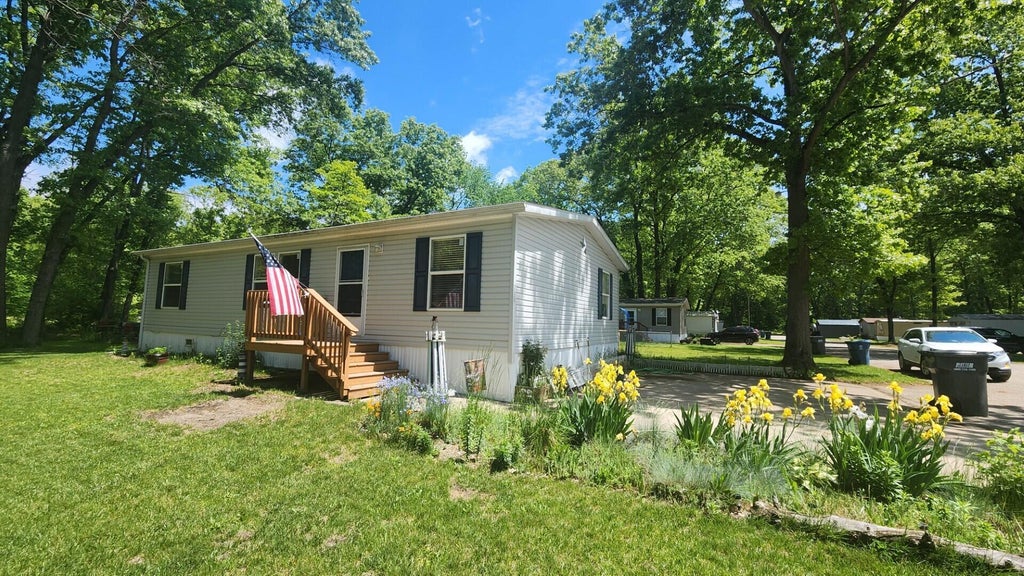 Country charmer located in ever popular Hopkins School District. Modern open floor plan. Huge kitchen island with seating and nice appliances; stove, refrigerator & dishwasher included. Mudroom and main floor laundry (includes washer & dryer) off kitchen w/EZ access to rear yard & shed. 3 beds and 2 full baths includes primary bed w/large private bath. Home was built in 2018, gutters w/gutter guards were installed in 2024 and has a transferable warranty/per seller. Nice, shaded lot and large cemented off-street parking. Very affordable living with quick possession possible. Come check it out! Disclosure: home is located in Sapphire Estates Mobile Home Park and transaction subject to park approval of the buyer prior to close. Park contact is Donna 616 681 1334 for any park info.