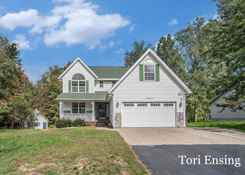 Great location on Greenville's west side! Large lot w/220 ft of pond frontage on over 1 acre. 4 bedroom, 2 1/2 bath, 2-story home. Main entry features an open stairway to upper level, large living room w/gas fireplace, gorgeous kitchen w/quartz counters & island that's open to the dining area w/slider to the deck. Half bath & main floor laundry. Upstairs is the primary suite w/cathedral ceiling, bath w/two sinks, ceramic tiled shower, & jetted tub. Bath leads into a finished bonus room over the garage w/hardwood flooring & 2 large closets. Two additional bedrooms are upstairs along with full bath.The lower level features a family room w/slider to an outside patio, & extra finished room that could serve as a 4th bedroom or office, & mechanical room. Interior doors are 6 panel solid wood & home is wired for a generator. Outside is large 2 tier deck overlooking the pond, 2-stall attached insulated garage & an extra 16 X 20 garage w/loft storage.