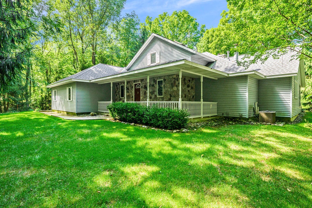 Tucked away in a private and tranquil wooded setting on 1.38 acres, this well-maintained home offers the perfect blend of comfort and nature. Featuring four spacious bedrooms and three full baths, it boasts a thoughtful floor plan with the convenience of main floor laundry. The inviting living spaces include two fireplaces for added warmth and charm, a wrap-around front porch ideal for relaxing, and a beautiful enclosed three-season room overlooking the serene, private backyard. Recent updates include a newer roof, providing peace of mind for years to come