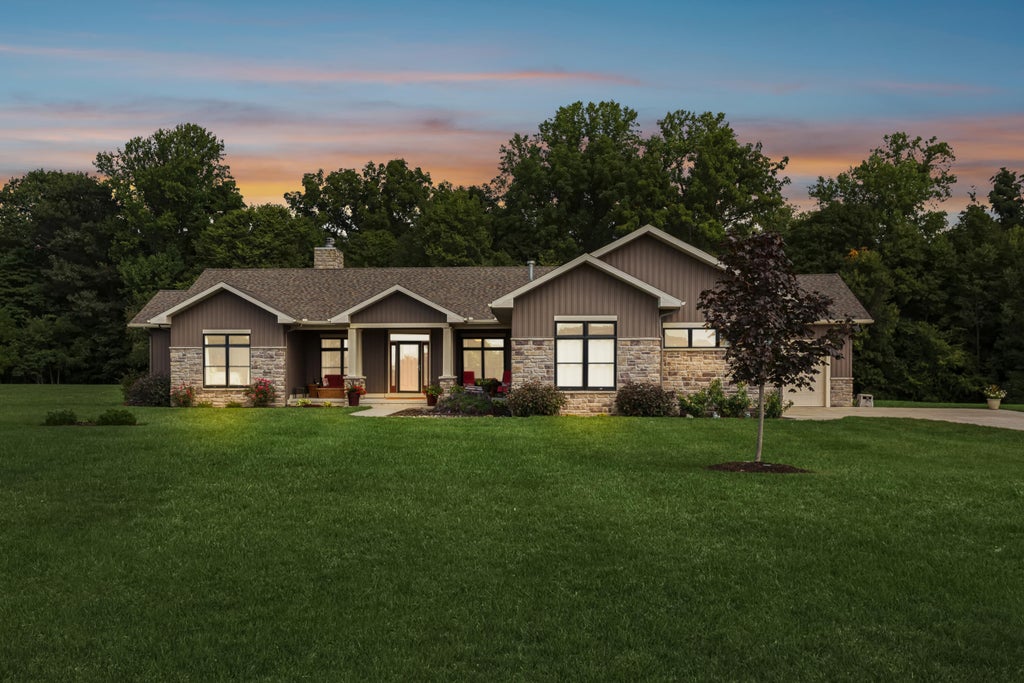Welcome to this beautifully built home that combines timeless quality with modern comfort. Designed with all your daily needs on one floor, the open floor plan features a stately fireplace in the great room, gorgeous floors, exquisite hickory & maple cabinetry, quartz countertops, and a spacious walk-in pantry. Main floor primary w/soaking tub, walk in shower, and neutral decor throughout. Functionality meets style with a large laundry room, mudroom/landing area, along with a 3+car, heated garage. The full basement, boasting 9-foot ceilings and daylight windows, is ready to be finished to your liking--perfect for a recreation room, home theater, or gym. Step outside and enjoy the covered front patio as well as beautiful backyard patio overlooking gorgeous wooded area. Many upgrades throughout including 400 series windows, 30 year shingles and 500 gallon propane tank. Truly ready to move into!for car and truck enthusiasts! The full basement, with 9-foot ceilings and daylight windows, is insulated, framed, and plumbed for a full bath ready to be finished to your style. Outdoors, enjoy the tranquility from the covered front porch, or watch deer and other wildlife from the backyard patio overlooking a private wooded area. Loaded with upgrades and truly move-in ready, this home is a rare find.