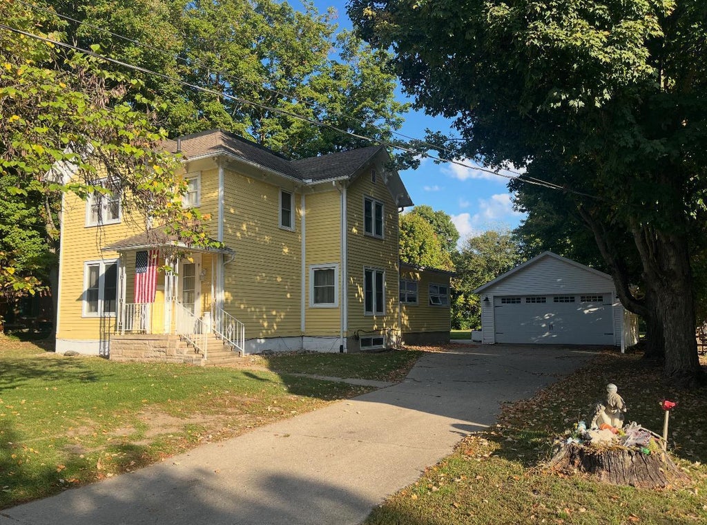 Step into timeless charm with this beautiful and historic single-family home offering soaring ceilings and spacious rooms. This move-in ready home is bursting with character, featuring original woodwork, gleaming wood floors, and double paneled doors leading into the den/parlor. The well maintained home offers 3 spacious bedrooms with larger closets, 2 updated bathrooms, and multiple living spaces including a family room, dining room, living room with floor to ceiling bookshelves, and the versatile den/parlor. The modern kitchen has been tastefully updated with stainless steel appliances, making it perfect for everyday living and entertaining. The recently renovated basement offers loads of additional storage space.Recent upgrades include a new HVAC system (2023), basement windows(2025), sump pump (2025) and a new 2 car garage(2021).The home features replacement windows and newer appliances throughout, including a basement dehumidifier and water softener. Outdoors, enjoy a quiet patio overlooking the expansive backyard, ideal for relaxing, bird watching, or family gatherings. Conveniently located near downtown, parks, and local amenities, this home balances historic charm with modern ease.