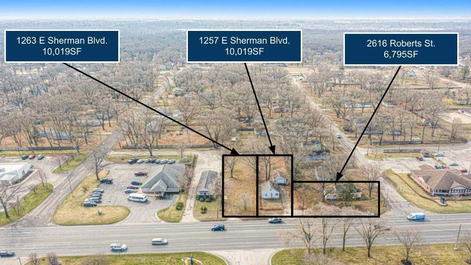 Located just west of US-31, this property offers exceptional visibility across from Trinity Health, Mercy Health's Mercy Campus and near numerous medical offices, Walgreens Pharmacy, and Watkins Pharmacy. Just east of US-31, you'll find major retailers like Sam's Club, Walmart, and Lowe's, along with a variety of restaurants.The vacant land and extra parcel with a home feature 218 feet of road frontage. The existing two-bedroom home, located at 1257 E Sherman could be occupied and house on Roberts is not occupiable. Selling as land. Opportunity to expand! 1263 E Sherman Blvd, Norton Shores, MI 49444 is also available for purchase.