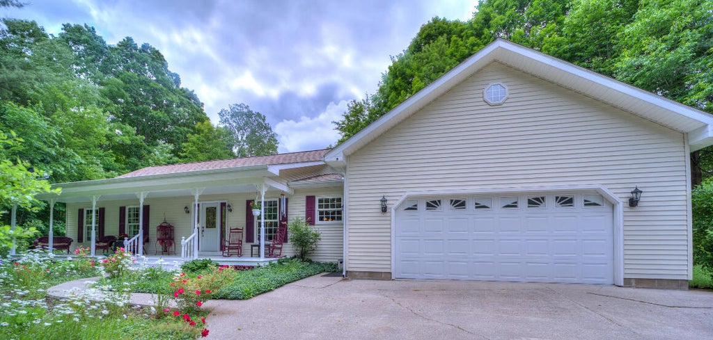 Motivated Seller! Recently split from a larger 10-acre parcel that originally included two homes. Nestled on a picturesque 7.24-acre lot with over 300 ft of White River frontage, this stunning ranch-style home offers the perfect blend of comfort and outdoor adventure. Built in 2002, this 5-bedroom, 2-bath home welcomes you with a full-length porch and an attached two-stall garage. Step inside to an open-concept kitchen, living, and dining area featuring vaulted ceilings, a cozy electric fireplace, gorgeous hardwood floors, and French doors leading to a spacious deck overlooking the serene landscape.The main floor includes a laundry room, an office/den (or 5th bedroom), a guest room, and a spacious primary suite with a soaker tub and walk-in closet. The lower walk-out level features twoadditional bedrooms, a recreation room, and ample storage space. A whole-house Generac generator ensures peace of mind, and there's an option for a wood-burning setup if desired.