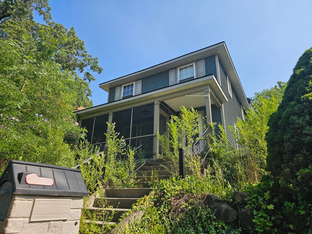 This 3-bedroom, 1.5-bath home, built in 2002, sits high on a terraced lot and offers rare privacy in a city setting. The screened-in front porch overlooks the multi-level yard, while the fully fenced backyard provides a mix of sun and shade, along with covered sitting areas.Inside, the main level features a spacious living room with large windows that bring in plenty of natural light. The distinctive 1950s-style kitchen includes a large island and is perfect for entertaining, with a convenient half bath just off the kitchen. Upstairs are three nicely sized bedrooms and a full bathroom. The daylight basement offers additional living space, natural light, and generous storage. A detached garage adds even more functionality to this unique property.Located in a convenient area, this home blends space and character with city access.