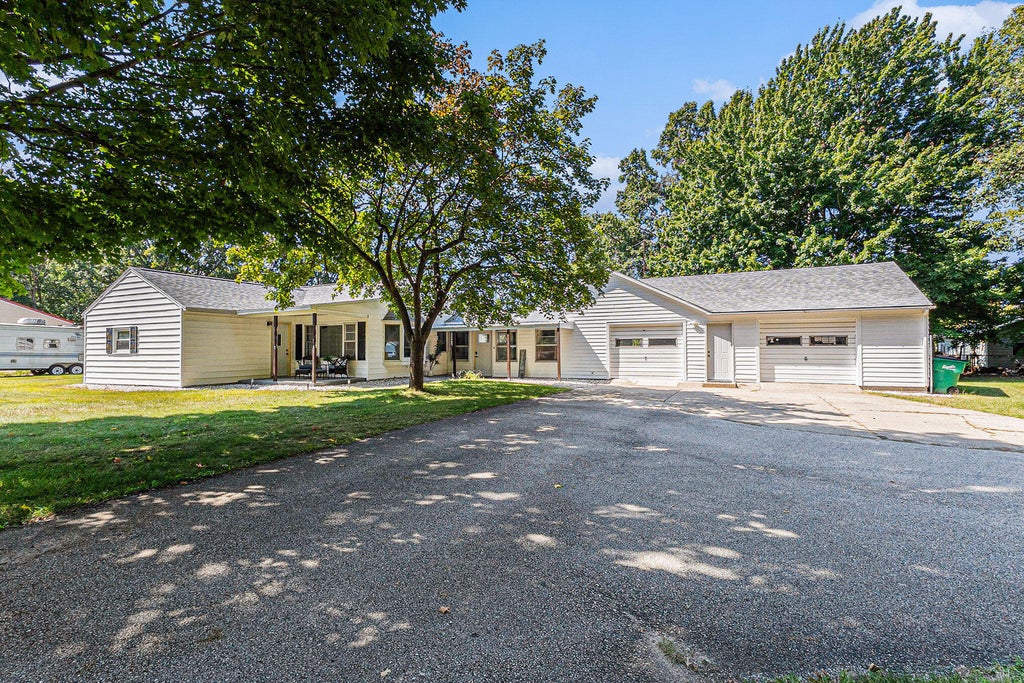 Fruitport ranch on a quiet cul-de-sac! This 1,300 sqft home sits on a wonderful half acre lot. The home offers main floor living, with 3 bedrooms, 1 full bathroom and a spacious kitchen with tons of counter space. The living room has two large windows, letting in plenty of natural light. The oversized 2 stall garage, and large shed are both great for outdoor storage and parking. You will love spending summer nights in the spacious yard and on the patio or in the gazebo. Updates within the last 3 years include new roof (2022), new furnace w/ AC (2022), new water heater (2023), new floors, some new windows, and new tub/toilet. Convenient location close to many stores and restaurants. Seller is a licensed Realtor. Buyer to verify all information.