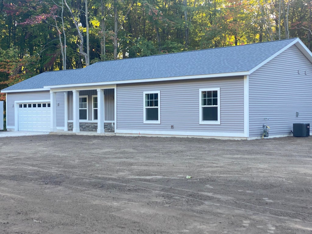 Well-built 3-bedroom, 2 full bathrooms, ranch home. Features 9ft sidewalls. Attached 24ft x 26ft garage with built in shelves. 1.5 wooded acres. City water and sewer. Spring Lake Schools. Ready to occupy new construction. Concrete patio off dining area. Tile shower in primary bathroom. No condo dues or restrictions. Quality built by J D Fisher Builders. First time live in MLS 10/10/25.