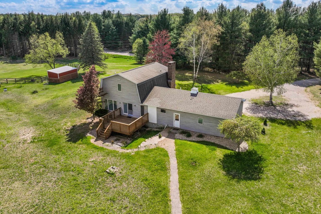 In the heart of Northern Michigan's horse country, this 3 bed, 4 bath home sits on 18 acres. Several outbuildings including horse stable and 30x40 stick built barn with water, electric and finished rooms. Five horse paddocks and 4 RV hookups make this expansive land perfect for housing horses and guests! Home features open kitchen and dining with beautiful views, living area with wood floors and natural stone fireplace. Three bedrooms on second floor, including private primary suite. The lower level is newly finished with full bathroom and offers plenty of space for recreation. Just 5 miles to Flint Fields Horse Park, home of the Great Lakes Equestrian Festival. Near thousands of acres of State land. Close to Traverse City, Elk Rapids and everything that Northern Michigan has to offer.