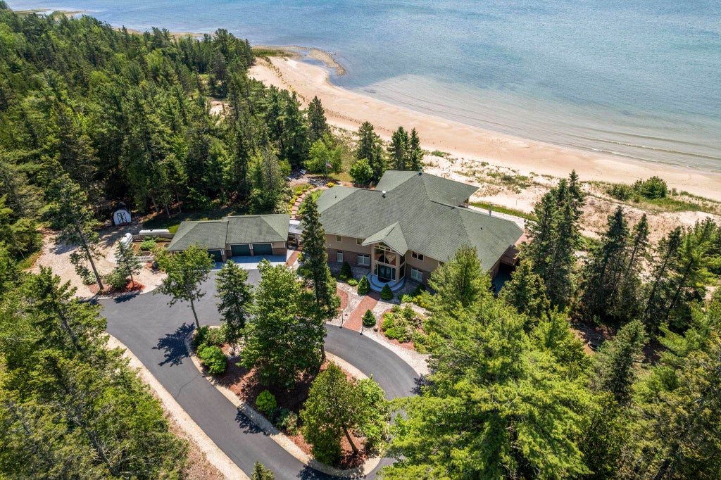 Experience unparalleled luxury and tranquility in this exquisite 5 bed/4.5 bath home, perched upon over 60 acres of pristine land between Manistique Township Park and Dutch Johns Point. Featuring approximately 2,700 ft of private water frontage on Lake Michigan, this property offers an exclusive retreat in a breathtaking natural lakefront setting. This one-of-a-kind home features open concept living spaces with floor-to-ceiling windows flooding the rooms with natural light and offering unrestricted panoramic water views. The chef's kitchen is equipped with high-end appliances, custom cabinetry, and a large island. 4 spacious bedrooms, each with their own en-suite bath, offer comfort and privacy. The Primary suite is a true sanctuary to itself with a spa-like bathroom, walk-in closets, and a private balcony overlooking the water. The main level is also equipped with a home office/den. Additionally, an expansive 4-car garage provides ample space for vehicles, boats, water toys, snowmobiles, RV's, and storage. Also included is a 30x40 heated and insulated pole barn with hook ups for a coach and motorhome, and a sleeping or storage loft on the second floor. Located a short 2-mile drive to local Manistique amenities, dining, wineries, breweries, entertainment, schools, the hospital, and the municipal airport for convenient fly-in options. This stunning home is a rare find, offering a perfect blend of elegance, privacy, comfort, and natural surroundings- the epitome of waterfront living. Enjoy one of the most spectacular waterfront properties in Michigan's beautiful and scenic Upper Peninsula.