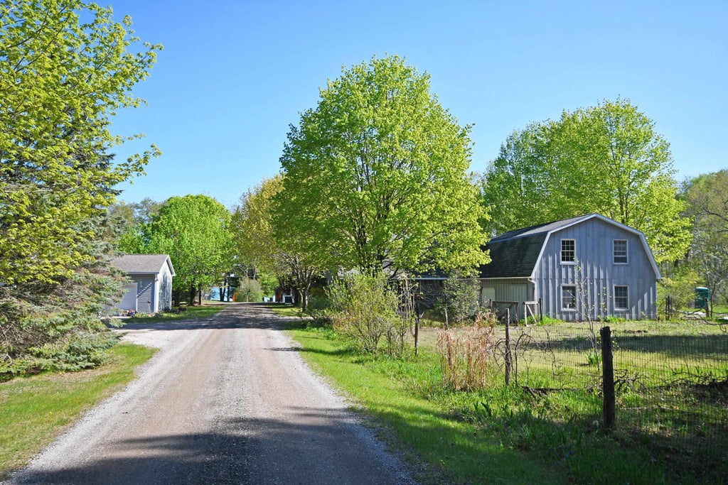 Such a phenomenal location! 7950 S Shorebird is a wonderful way to be immersed in the heart of the Sleeping Bear Dunes National Lakeshore. Located across from Little Glen lake on a .78 acre lot, there are peek-a-boo views of the lake's turquoise water from the front yard and porch of the home, and the Heritage Trail, ideal for walking, biking, and cross country skiing, is directly across from the home, as well, making for a quick journey to the Dune Climb, or a bike ride in to Glen Haven Beach, Glen Arbor or Empire. Imagine quiet nights around a bonfire, jaunts in to one of the area's charming, small towns for dinners out, ice cream, art galleries, or live music, sunsets from the dunes, and the myriad of hiking trails and water access nearby. This Dutch Colonial/Farmhouse style home, with over 2,200 square feet, has so much potential to become exactly what you're seeking! Inside, there are two bedrooms, two bathrooms, a very large loft (being used as a third bedroom), pine planked ceilings, a spacious kitchen and dining area, living room with vaulted ceilings, storage spaces, a laundry/mud room off the entry, and a charming porch with glimpses of Little Glen Lake. Outside, the two car garage is also oversized, with an unfinished living space above (19'x40'). Past the garage is a large, sunlit area, which would be fantastic used as a garden, as well as a 30x40 pole barn, perfect for storing a boat! Bring your vision for what could become a dream property!