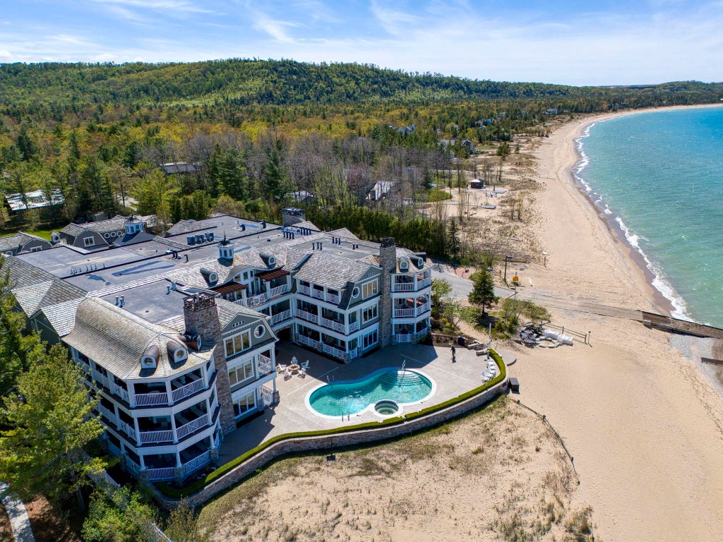 Welcome to Le Bear, an exclusive Residence Club designed for the worlds most discerning waterfront owners-where elite design and five-star service converge in the heart of Glen Arbor, named ‚Å“The Most Beautiful Place in America.‚ This rare offering is for full ownership of this residence, granting exclusive, unlimited use to this beautifully appointed 3-bedroom, 3-bath end-unit. Truly one of a kind, this custom, design-rich retreat is set within one of Lake Michigans most exclusive enclaves. Framed by panoramic views of the Manitou Islands, this residence is designed with a stunning wraparound deck perfect for tranquil mornings and worldclass sunsets. Inside, thoughtful details like wide-plank French Oak flooring, custom wallpaper, and nautical rope-inlaid trim set a tone of refined coastal elegance. From antique armoires to hand-selected furnishings, every element enhances the homes bespoke character. The kitchen is masterwork of form and function, featuring a quartzite counters & island, SubZero refrigerator, Wolf range, custom cabinetry, complimented by a charming banquette. Entertain in the formal dining room or relax in the hearth room with its gas fireplace. Just beyond, is a spacious entertaining great room that features another fireplace, deck access, and sweeping views of the Manitou Islands and Sleeping Bear Bay. The primary suite is a retreat unto itself and includes a walk-in closet with stained-glass doors and a spa-inspired bath with Kohler jetted tub and radiant heated floors. A private guest wing offers a second bedroom with deck access, a full bath, and den configured as a bedroom. Additional features: wine fridge pantry, dedicated laundry room with sink, dual-zone HVAC, reverse osmosis, on-demand hot water, and surround sound. All furnishings included (select artwork/items excluded). Owners enjoy indoor/outdoor pools, billiard room, fitness center, sauna, housekeeping, maintenance service, and private Lake Michigan beach access.
