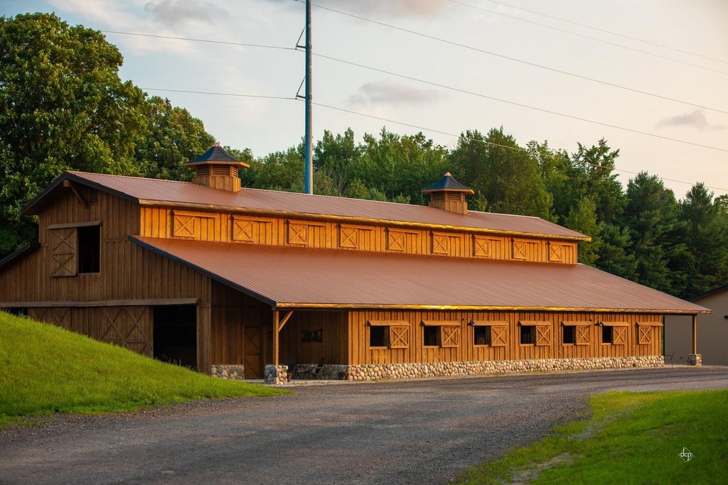 Ridgeback Equestrian Facility is a premier 19.4-acre property located just 7.5 miles from Flintfields Horse Park, home of the renowned Traverse City Horse Shows. Designed with both function and beauty in mind, the property features three barns, an indoor arena, multiple paddocks, and two RV hookups. The main barn is a standout with its cedar and stone exterior and hand-cut maple interior. It offers twenty-two 12x12 fully matted stalls, overhead fans, a wash stall, grooming stalls, hayloft, two tack rooms, 22 individual tack lockers, a bathroom with shower, and a climate-controlled lounge. The upper small barn includes three stalls, while the auxiliary barn provides an additional 12 stalls with mattress flooring, overhead fans, a wash stall, grooming stall, and a tack room, and is directly connected to the 80x180 indoor arena. A separate building site with its own driveway offers the perfect spot to build your dream home with views over the farm and potential bay views.