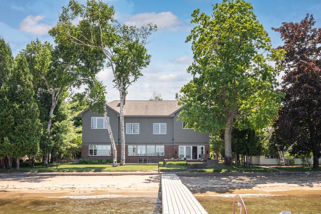 If you've been in search of the perfect family legacy home on Big Glen Lake, your quest may be over! This spectacular property is located on one of the best sandy beaches on the lake, the quiet little enclave of Whispering Pines, coveted by the discerning buyer looking for panoramic views of the ridge lines that surround the lake, Caribbean colored waters, and hard sandy lake bottom. You'll make generations of family memories as you gather for summers and holidays in this spacious, very well maintained home. Family and friends can gather to prepare feasts in the spacious kitchen with granite counter tops and hardwood floors, newer stainless steel appliances make the task at hand a joy for all involved! Cozy up in the lake facing great room with a wood burning fireplace after a fun day on the water, or as you celebrate the Christmas holidays. Every day will start out on the right foot as you and your guests rise to greet the day from each of the lake side bedrooms, with the primary/master suite on the main level and other bedrooms on the upper. Plenty of bathrooms to accommodate the crowds, with tile floors, some with custom tile showers, or tub surrounds, or Jack/Jill style split layouts. Extra spaces include a main floor office/study, upper level exercise area, and a lounge/family room, a great spot for media or games of all sorts! The spacious, oversized & attached garage is finished nicely with lots of storage capacity. The houses' brick and cedar shingle exterior is complemented by brick paver walkways, a beach side court yard, and an elegant south facing courtyard entry, flanked by a beautifully landscaped yard.