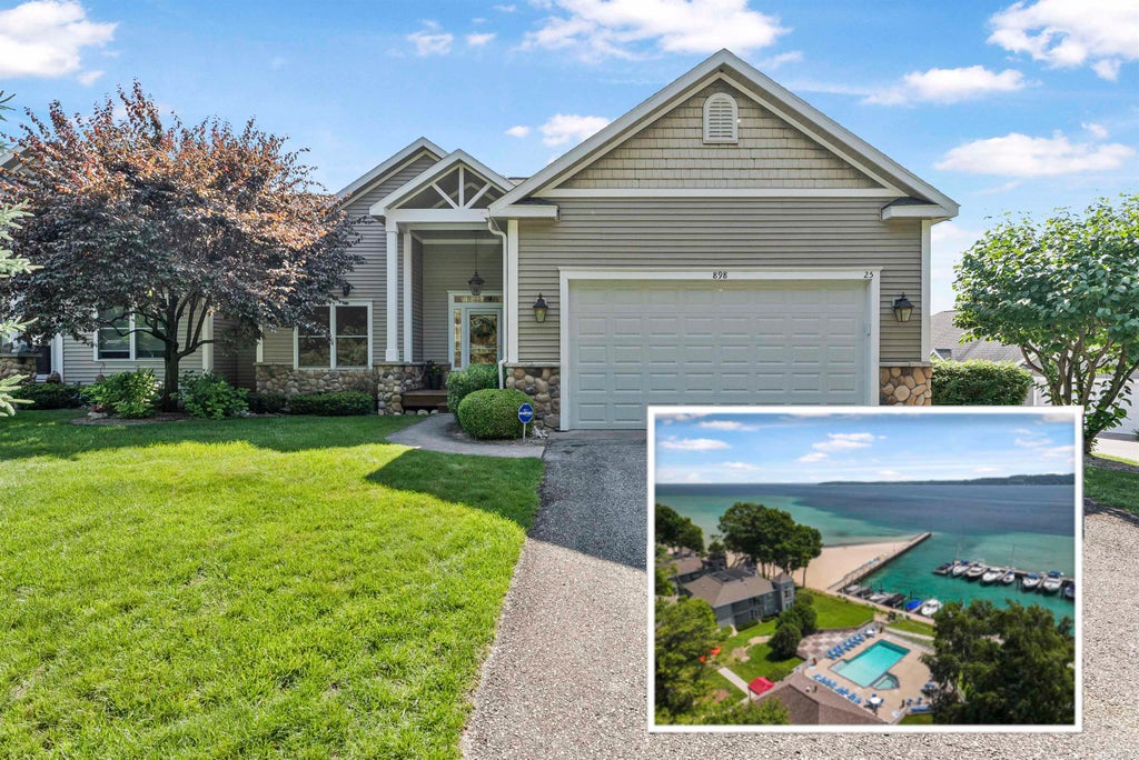 Welcome to this stunning Bay Cliff condo in the Village of Suttons Bay. A true gem that boasts breathtaking bay views and an array of beautiful updates designed to elevate your lifestyle. This freshly renovated residence offers spacious main floor living including a fully updated primary suite complete with new tile shower, flooring, soaking tub, lighting and fixtures that are sure to please. Down the hall is a guest bedroom or office, and powder room. A total of four bedrooms and two and a half baths for a total of 3,258 square feet of refined living space. Other quality features include wood floors, beamed ceilings, built-in bookcases, new lighting, and a natural gas stone fireplace that invites warmth and comfort. The culinary enthusiast will appreciate the updated kitchen, complete with new quartz countertops, elegant white cabinetry, sleek stainless steel appliances, and water views for a delightful cooking experience. Just off the kitchen is the laundry room with additional cabinetry, pantry, and convenient access to the 2-car garage. The walkout lower level has two additional bedrooms, a large family room, a gorgeous new guest bath, and a bonus room for crafting or storage. Imagine sipping your favorite beverage on the deck or patio as you watch freighters and boats glide across the water. The community offers an impressive array of amenities, including a sparkling pool, clubhouse, tennis courts, scenic hiking trails, and a pristine 1200-foot sandy beach, all set in picturesque Suttons Bay. It is more than a home; its maintenance-free living waiting to be embraced. Move-in and enjoy!