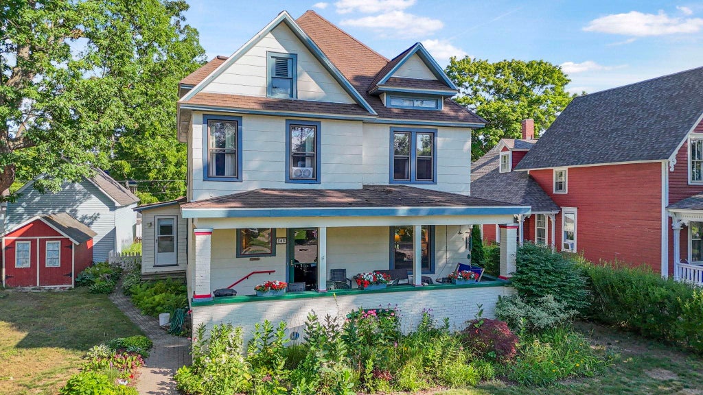 Step into timeless charm with this beautifully maintained 2,160 sq ft historic American Foursquare home just a few blocks from downtown Cadillac. This 5-bedroom, 2-bath home blends vintage character with modern updates, offering both comfort and style. Original woodwork, beautiful French doors, and hardwood floors throughout, preserve the craftsmanship of the era. The spacious living room features a natural gas stove insert, perfect for cozy evenings, while the formal dining room opens to a bright, updated kitchen with custom Amish-built cabinets, a walk-in pantry, and ample workspace. Main floor laundry adds convenience, and the main floor primary bedroom, which has shared access with the bathroom, could alternately be used as a den/office. Upgrades include new windows, updated electrical, and plumbing, remodeled bathrooms and a new back deck ensuring peace of mind for years to come. Upstairs, four roomy bedrooms provide plenty of space for family and guests, with abundant natural light and original charm. An updated bathroom is conveniently located just steps away from the bedrooms. The full basement offers additional storage or hobby space. Outdoors, the beautifully landscaped backyard creates a private retreat for relaxing or entertaining with an abundance of perennials including orange and pink poppies, tulips, Siberian iris and more, along with an ornamental Japanese red maple. Enjoy your morning coffee on the inviting covered front porch and make use of the 1-car garage for parking and storage. With its prime location near Franklin school, downtown shops, dining, and Lake Cadillac, this home offers the perfect combination of historic elegance, modern convenience, and walkable living. A rare find-ready to welcome you home.
